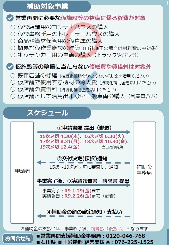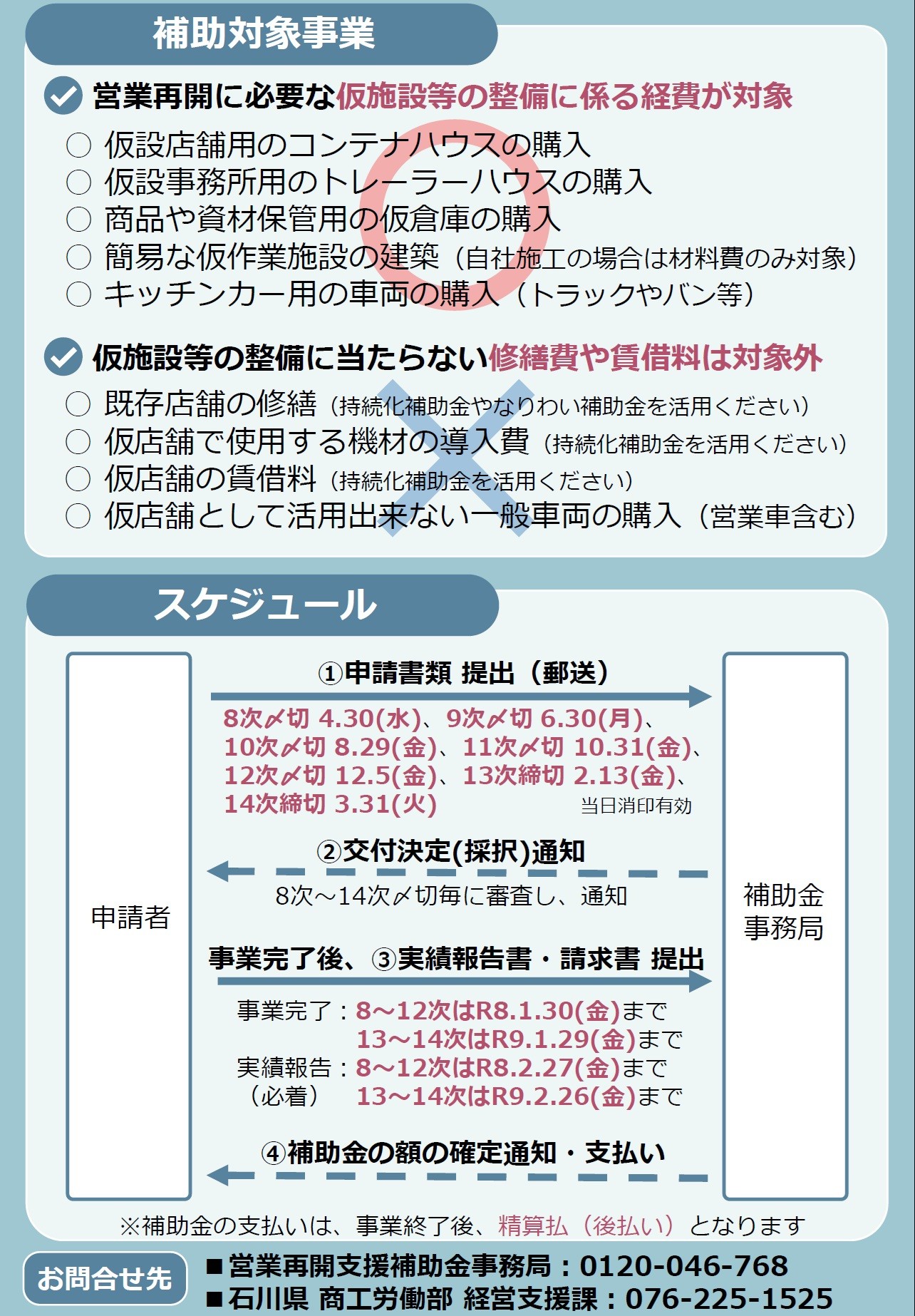 【営業再開支援補助金事務局】 フリーダイヤル:0120-046-768(土日祝日を除く10:00~17:00) 住 所:〒920-8203 |