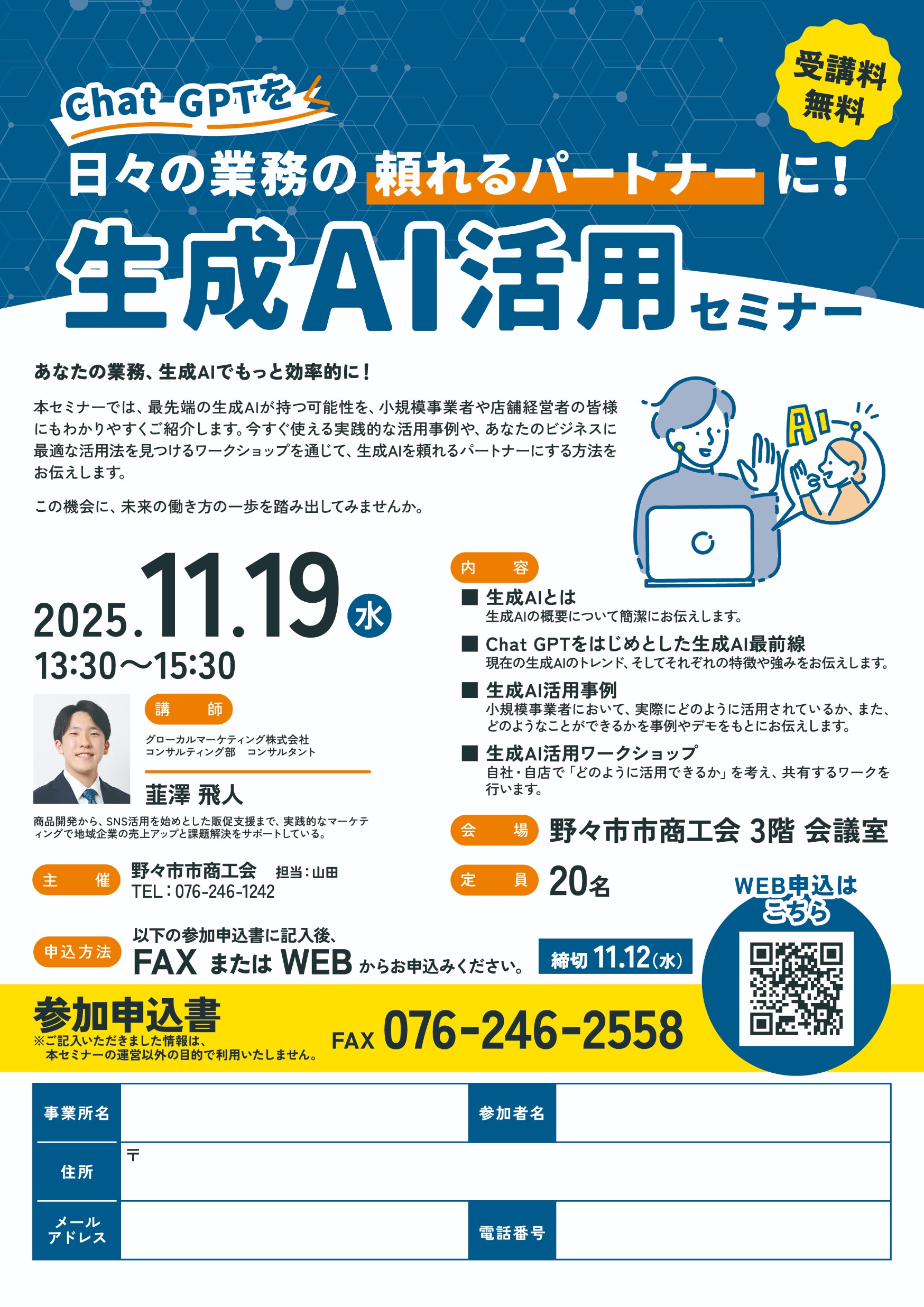■日 時:11月19日(水)■場 所:野々市市商工会館3階研修室■参加費:無料