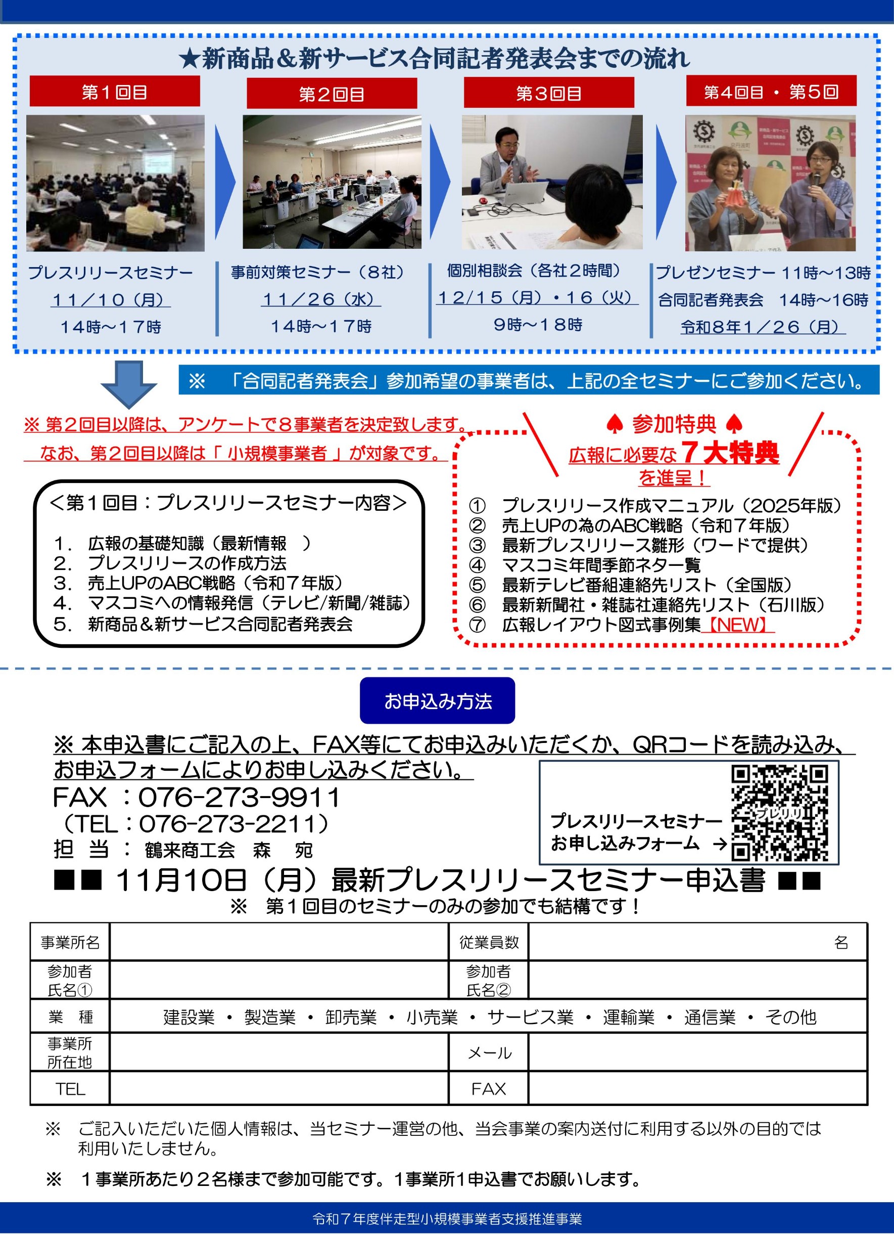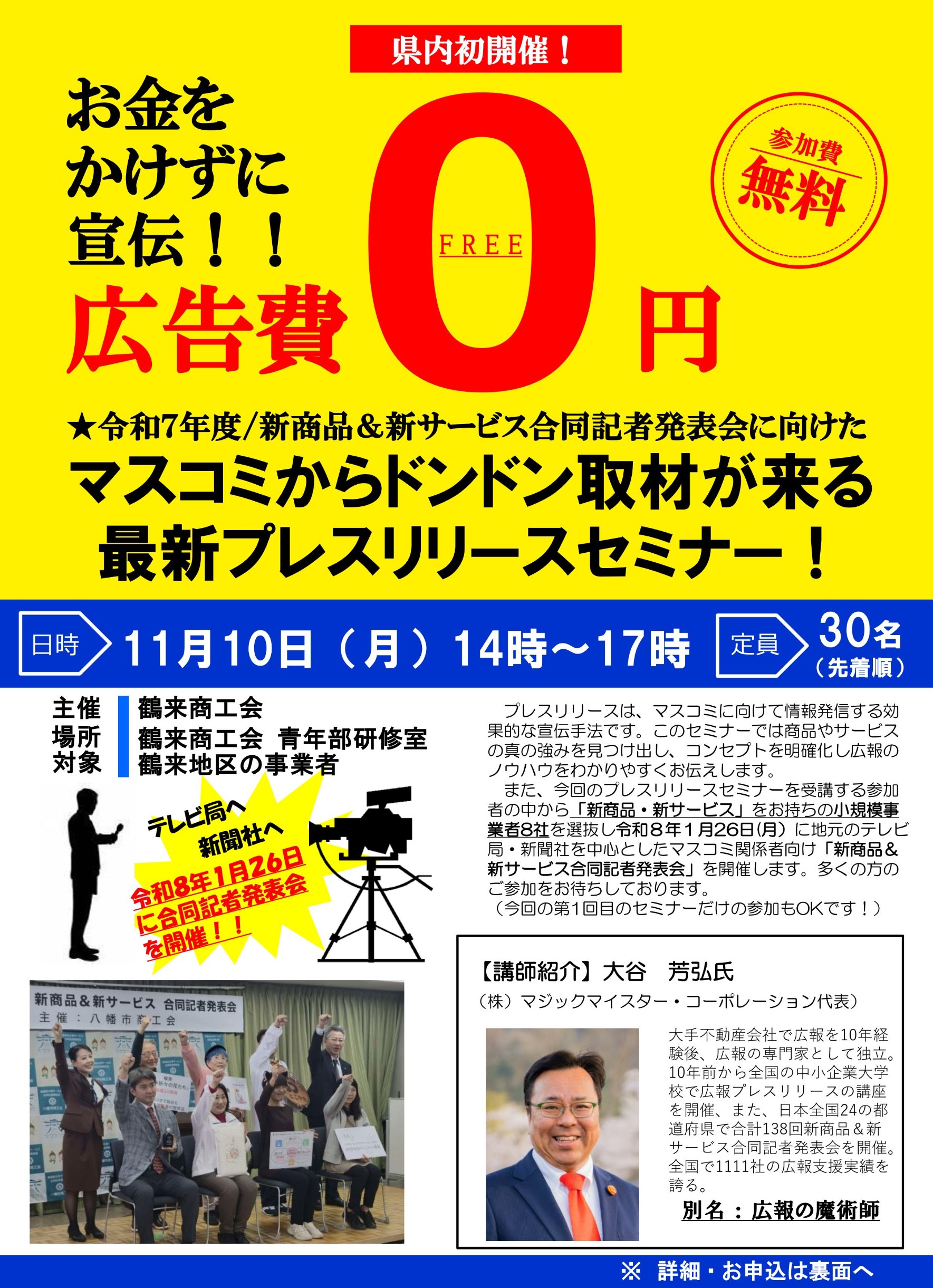 さらに今回、プレスリリースセミナーに参加された小規模事業者の中から8事業者を選定し、新商品等の合同記者発表会を実施します。この機会をぜひお見逃しなく!!