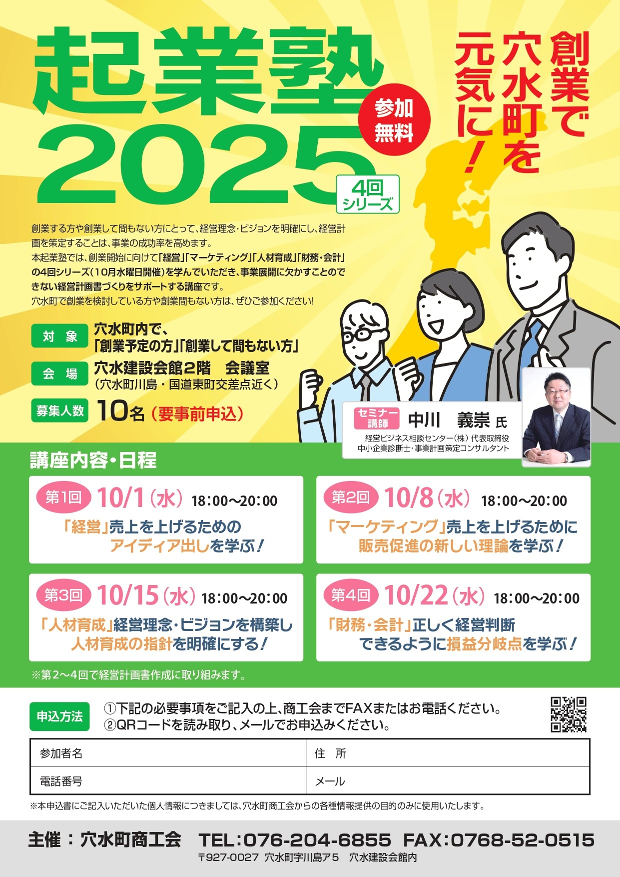 穴水町商工会では、町内で「創業を予定している方」「創業して間もない方」を対象に、経営に必要な基礎を学びながら経営計画書づくりをサポートする 「起業塾2025」 を開催します。