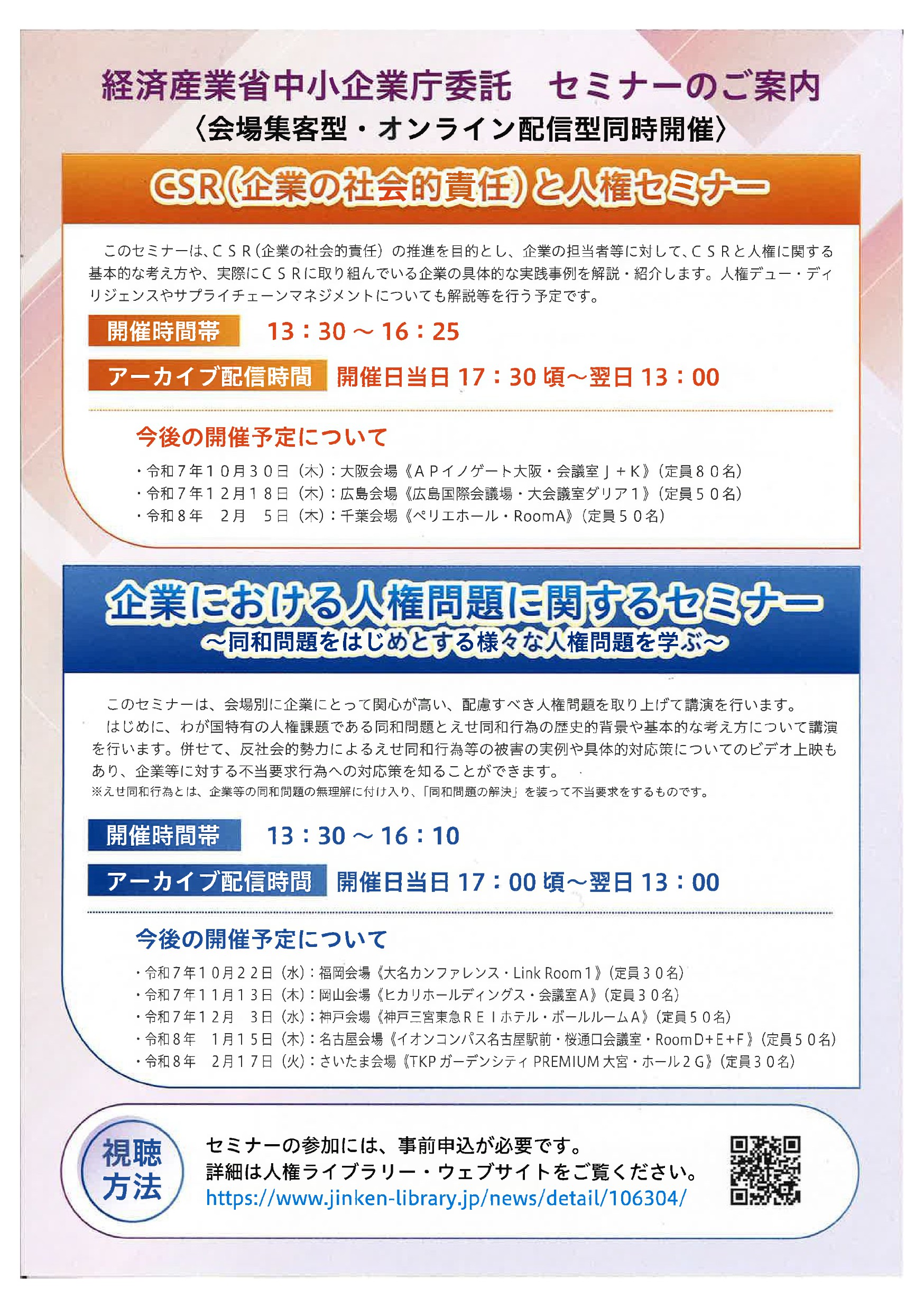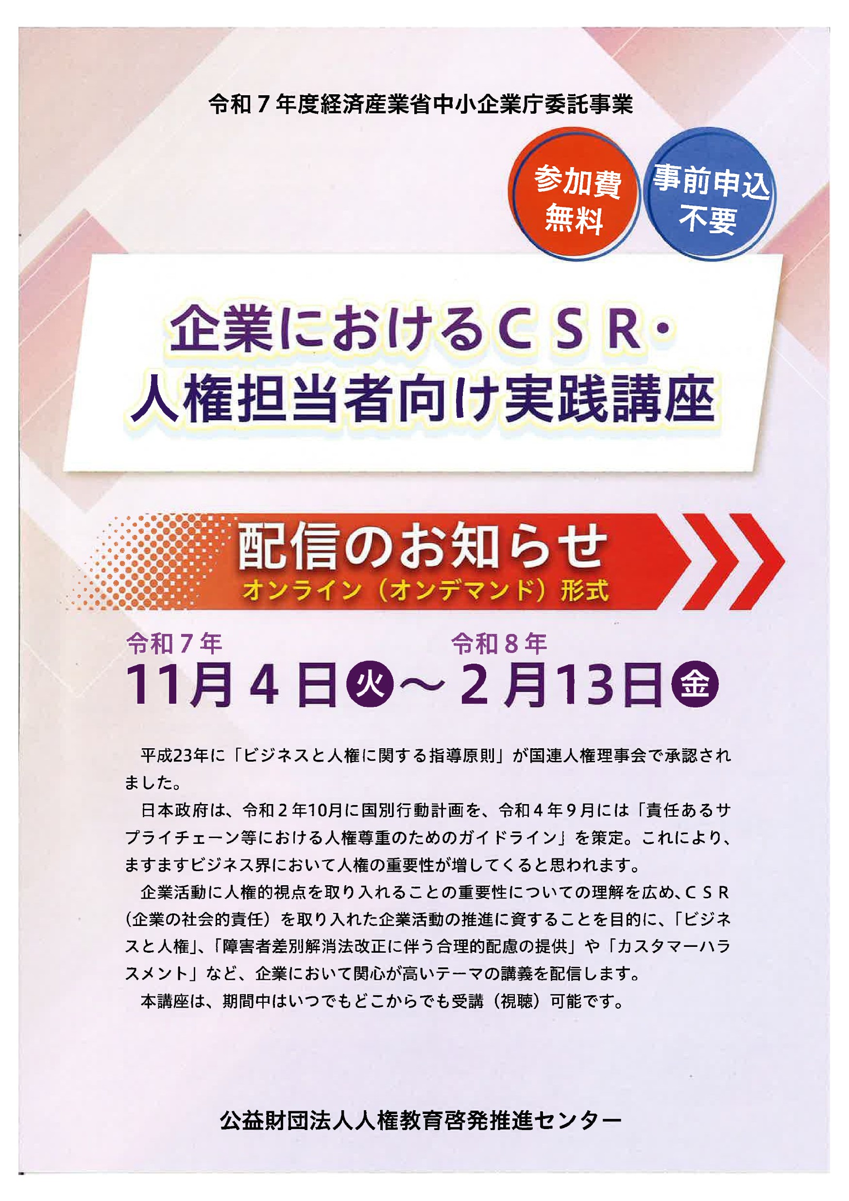 公益財団法人人権教育啓発推進センターでは、経済産業省中小企業庁の委託を受け、「企業におけるCSR・人権担当者向け実践講座」を令和7年11月4日(火)~令和8年2月13日(金)に配信することとなりました。