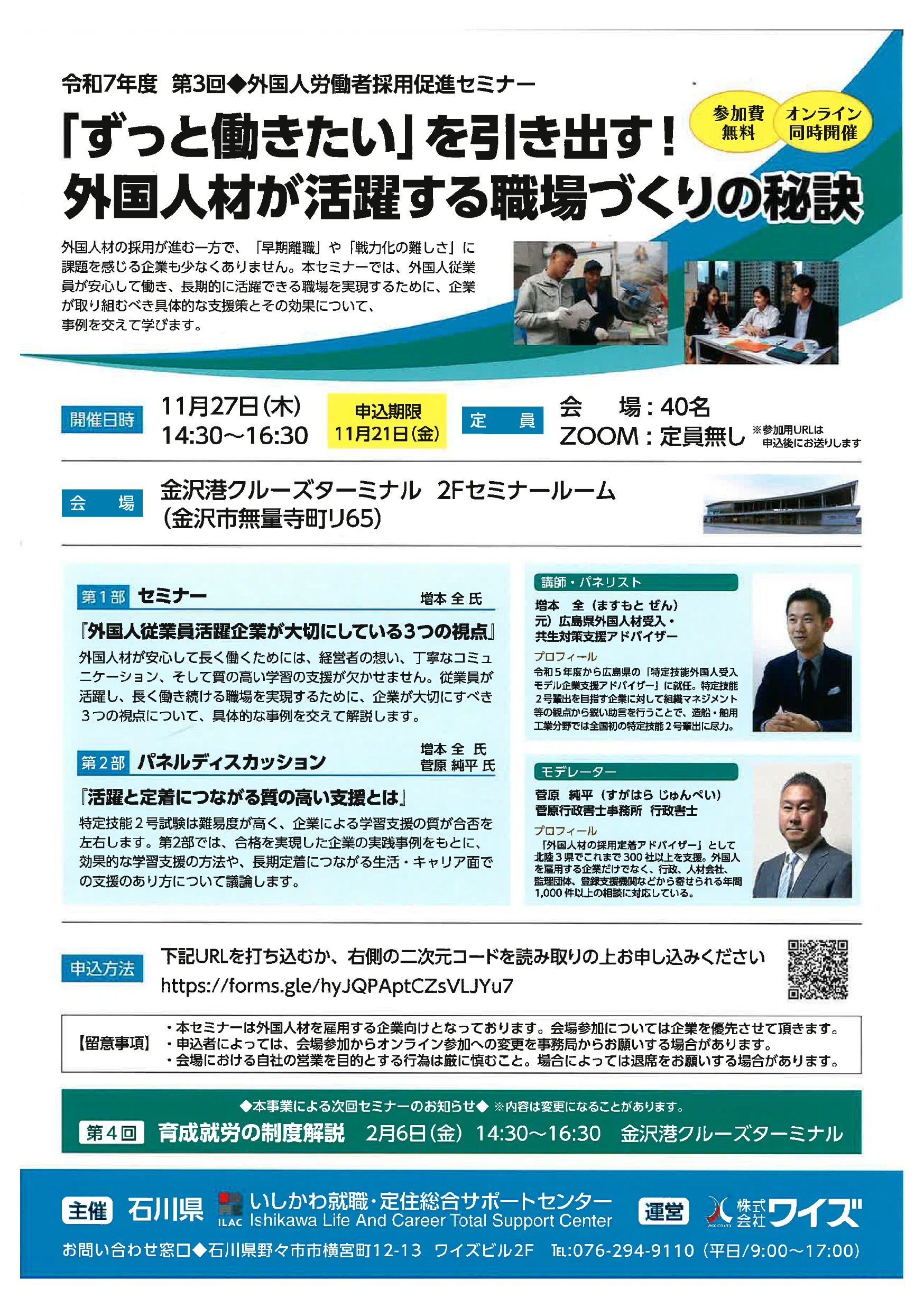 令和7年度 第3回◆外国人労働者採用促進セミナー 「ずっと働きたい」を引き出す! 外国人材が活躍する職場づくりの秘訣
