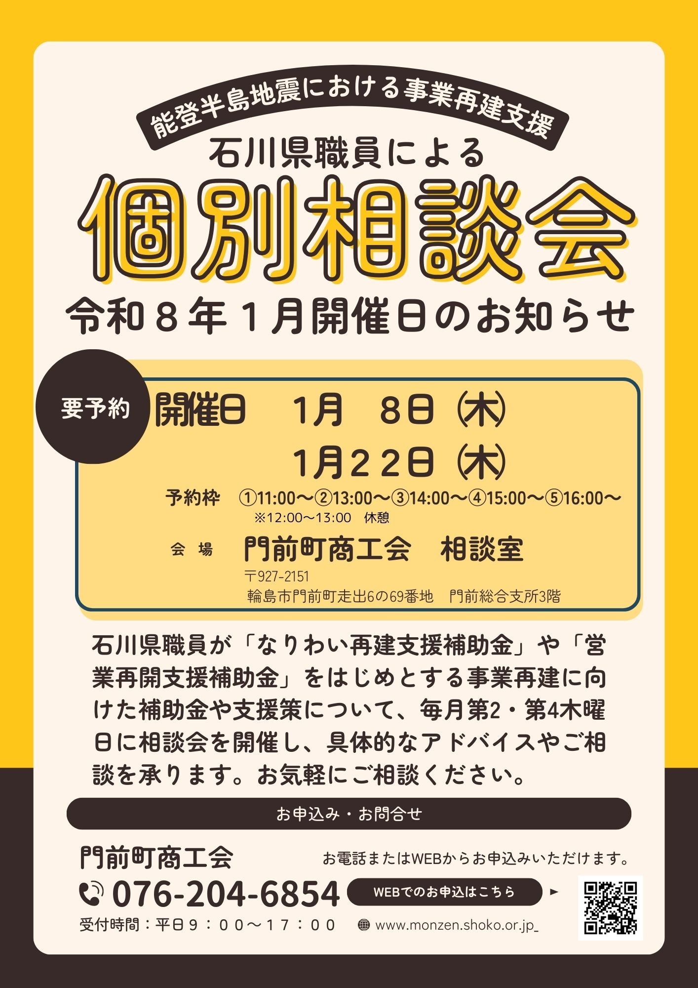 石川県職員による「なりわい再建支援補助金」や「営業再開支援補助金」を中心とした事業再建に向けた相談会を、下記のとおりに開催いたします。