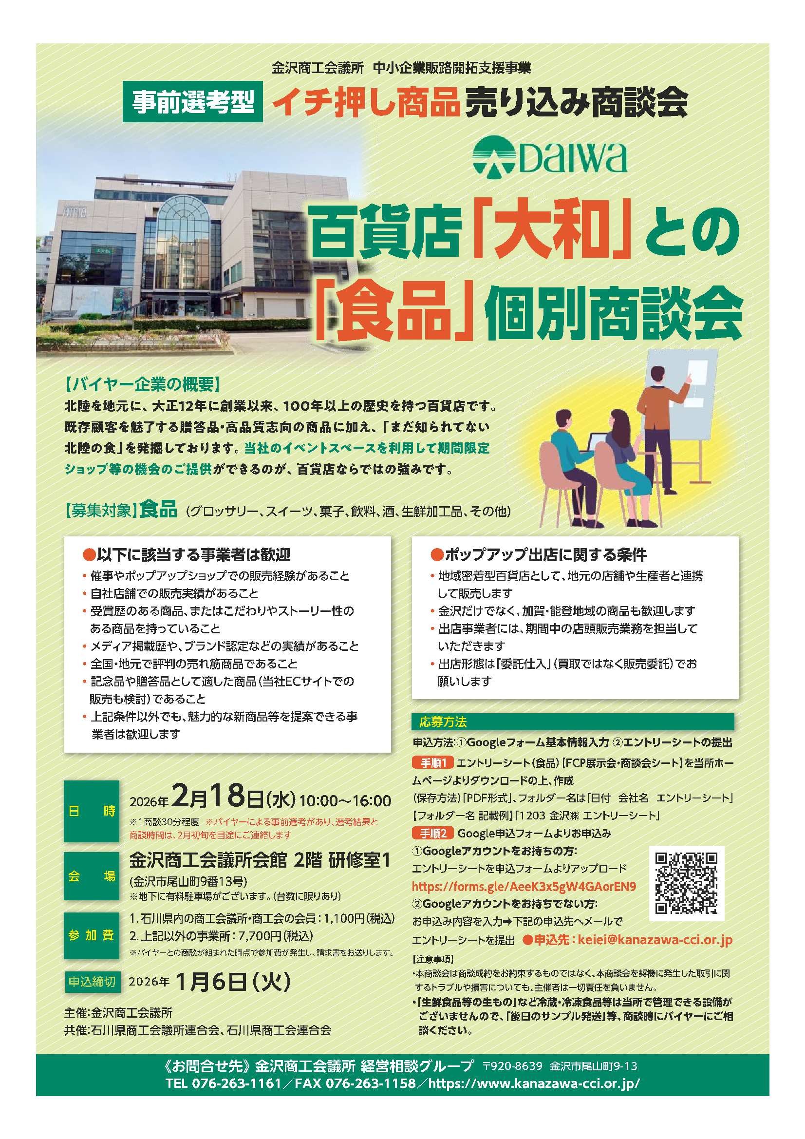石川県内の商工会議所と商工会が協力し、百貨店「大和」との商談チャンスの場を事業者の皆様にご提供することで、中小企業・小規模事業者の新規取引や販路開拓支援を支援します。商談を希望される方は、ぜひお申込みください。