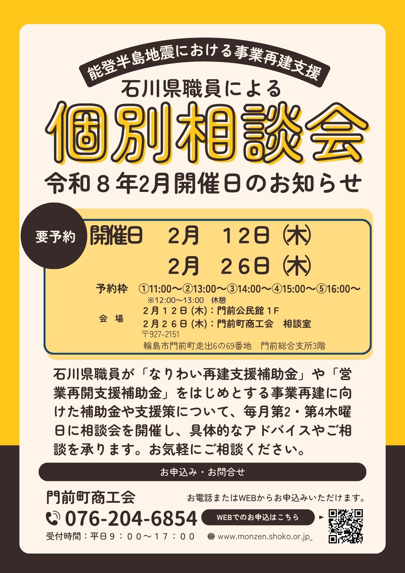 令和8年2月26日【木】:門前町商工会(門前総合支所3F)