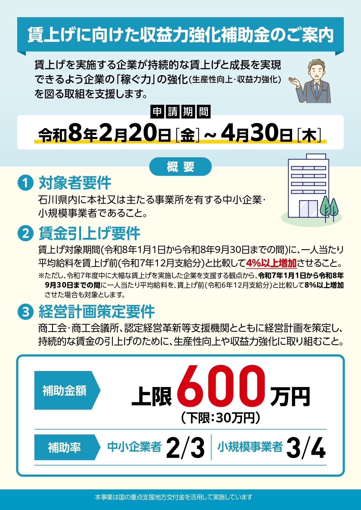 深刻な人手不足や物価高騰が続く中、令和8年春以降も持続的な賃上げと成長を実現するため、生産性向上や収益力強化に取り組む費用を補助するものです。