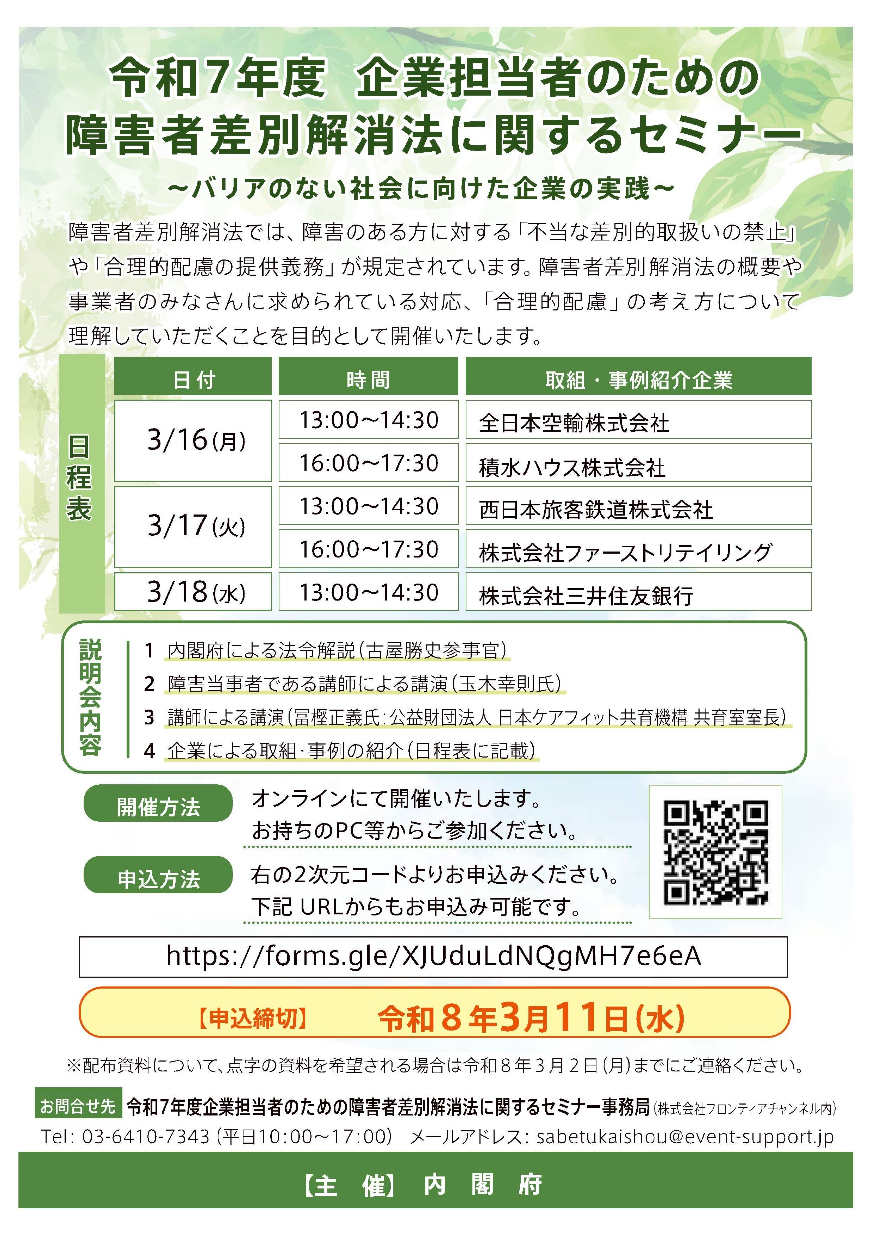 内閣府では、事業者を対象とした改正法に係る説明会「令和7年度企業担当者のための障害者差別解消法に関するセミナー~バリアのない社会に向けた企業の実践~」を次のとおり開催します。