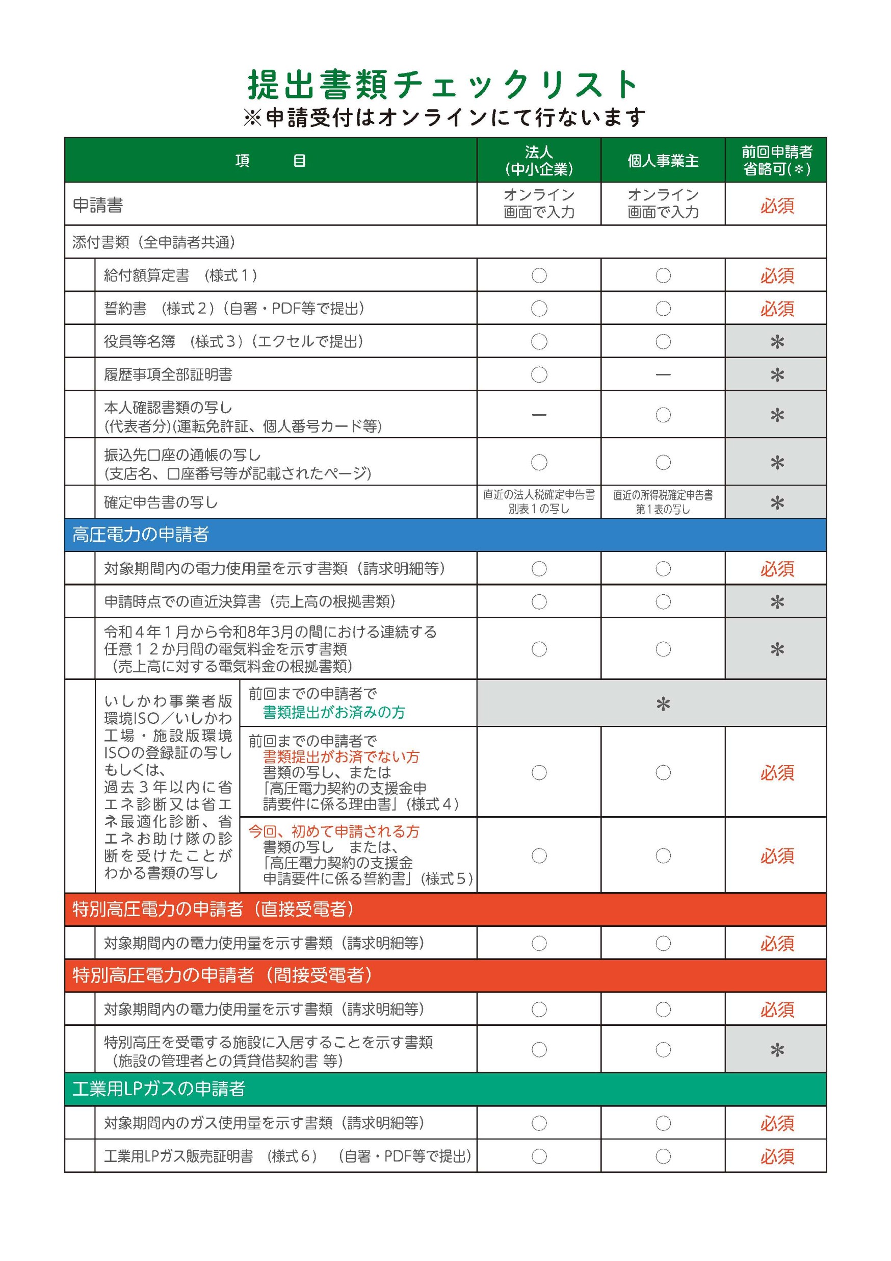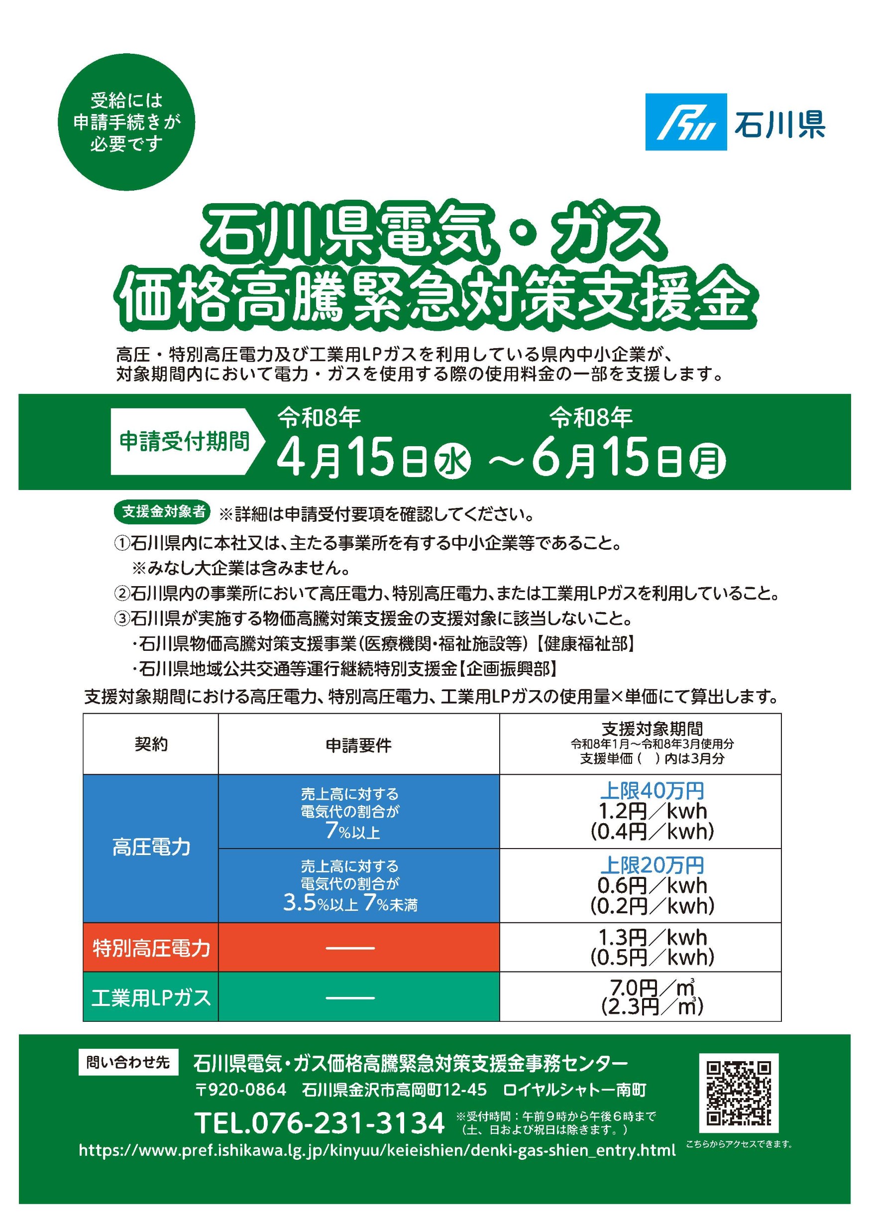 ---------- 申請受付期間: 令和8年4月15日(水)~6月15日(月) 高圧電力: 売上に対する電気代7%以上:1.2円/kwh(0.4円/kwh) 【上限40万円】 売上に対する電気代3.5%以上7%未満:0.6円/kwh(0.2円/kwh) 【上限20万円】 特別高圧: 1.3円/kwh(0.5円/kwh) 工業用LP: 7.0円/㎥(2.3円/㎥) ※令和8年1~3月使用分が対象。()カッコ内は3月分支援単価 お問い合わせ先: 石川県電気・ガス価格高騰緊急対策支援金事務センター 076-231-3134(平日9時~18時) ----------