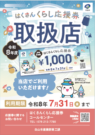 応援権が利用できる店舗についてはこちら(はくさん商工会議所特設サイト)からご確認ください。