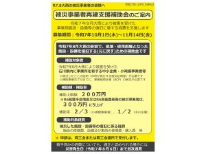 【能登町商工会】 令和7年8月大雨 被災事業者再建支援補助金【10/1受付開始】